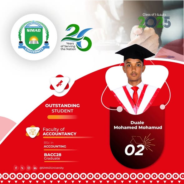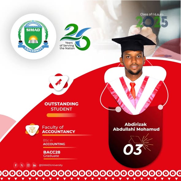 The Faculty of Accountancy, SIMAD University is proud to honor the exceptional achievements of the top three graduates from the Accounting Program, Class of 2025. These students have demonstrated remarkable dedication, strong academic performance, and unwavering commitment throughout their studies.